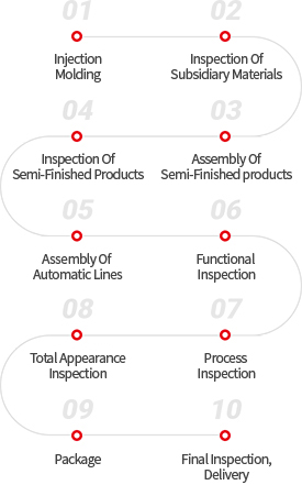 Installed automatic injection robots and conveyor belts for each of injection molding machine to avoid scratches and contamination. Operating the latest high-function facilities with excellent precision, and operates a separate facility maintenance team consisting of engineers with accumulated experience and technology to institutionalize regular inspections and preventive inspections, providing the basis for perfect product production in an optimal environment.