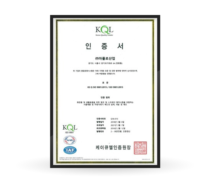 아폴로산업은 제품 또는 서비스의 실현 시스템이 규정된 요구 사항을 충족하고 이를 유효하게 운영하고 있음을 증명했습니다.